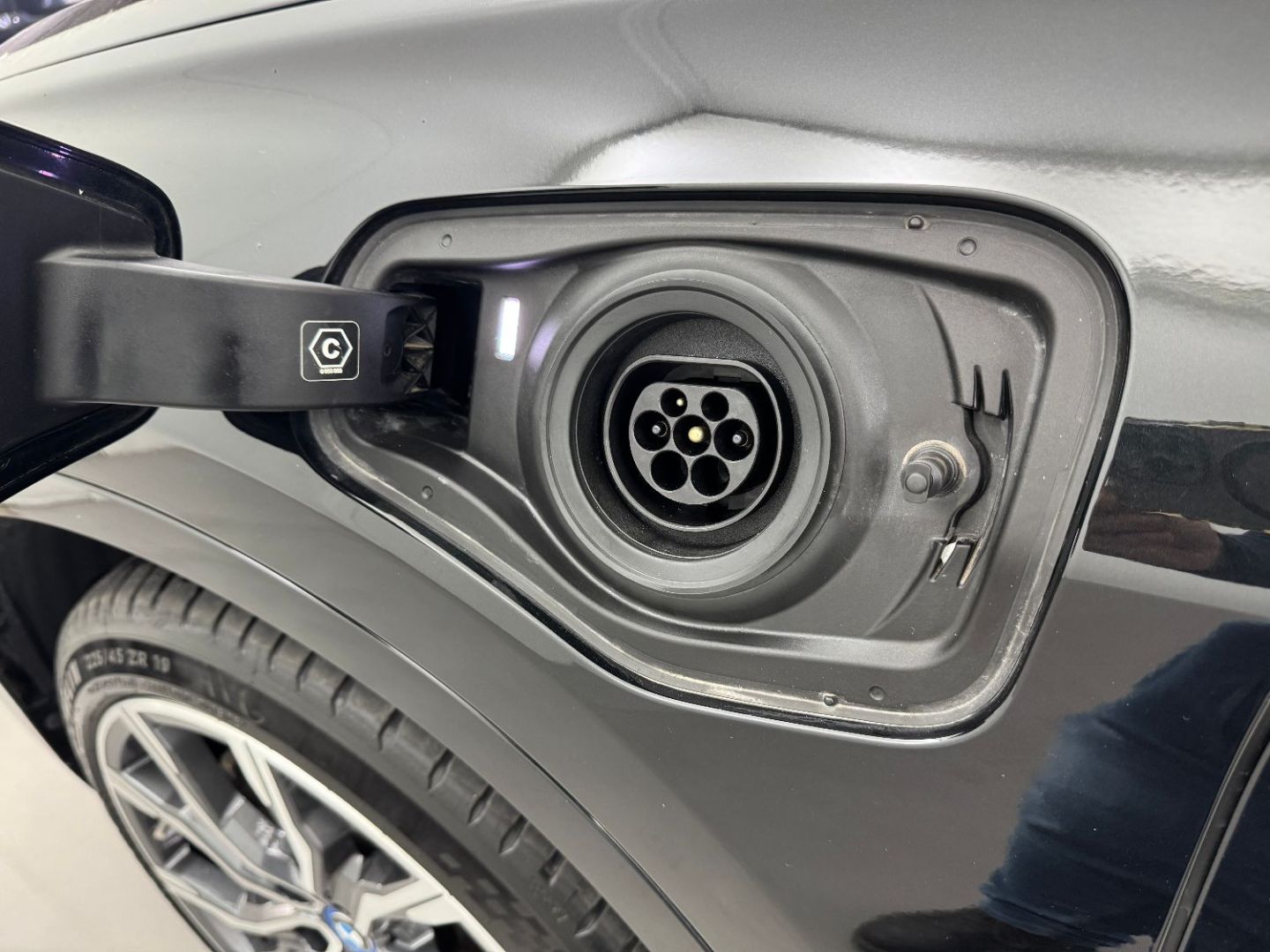 Trappe de recharge electrique cote conducteur avec badge "electrified by i" et signal lumineux de l'etat de charge